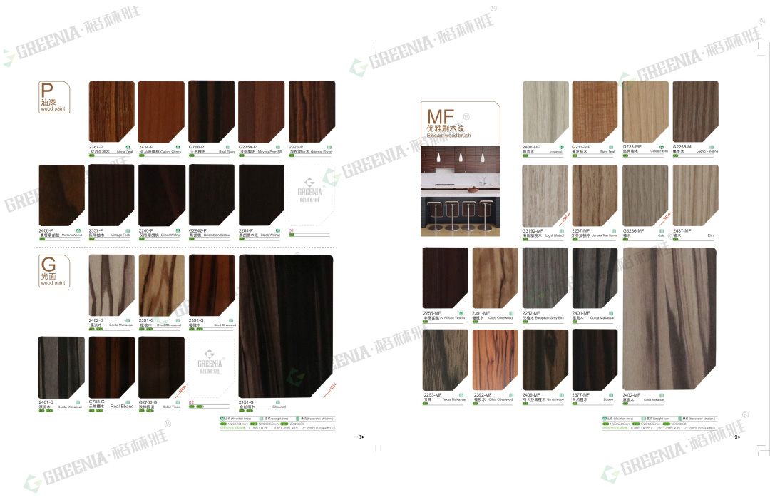 格林雅防火板擁有55種表面處理及3532種花色紋路,品種齊全。包括光面G、啞面M、絨面S、油漆P、霧面WS、波浪紋RS、壓木紋X、編織紋PX、優(yōu)雅皮紋XO、皮紋SL、壓木紋SH、拉絲ST、刷木紋F、優(yōu)雅刷木紋MF、絲絨面CF、羽翎面FT、纖絲紋、天然木皮、影點(diǎn)U、橫紋E、豎紋H、雨絲紋MV、橫紋WH、原木刷紋WB等多種不同的表面處理,可做成平板、彎曲板。歡迎您來(lái)樣定做!