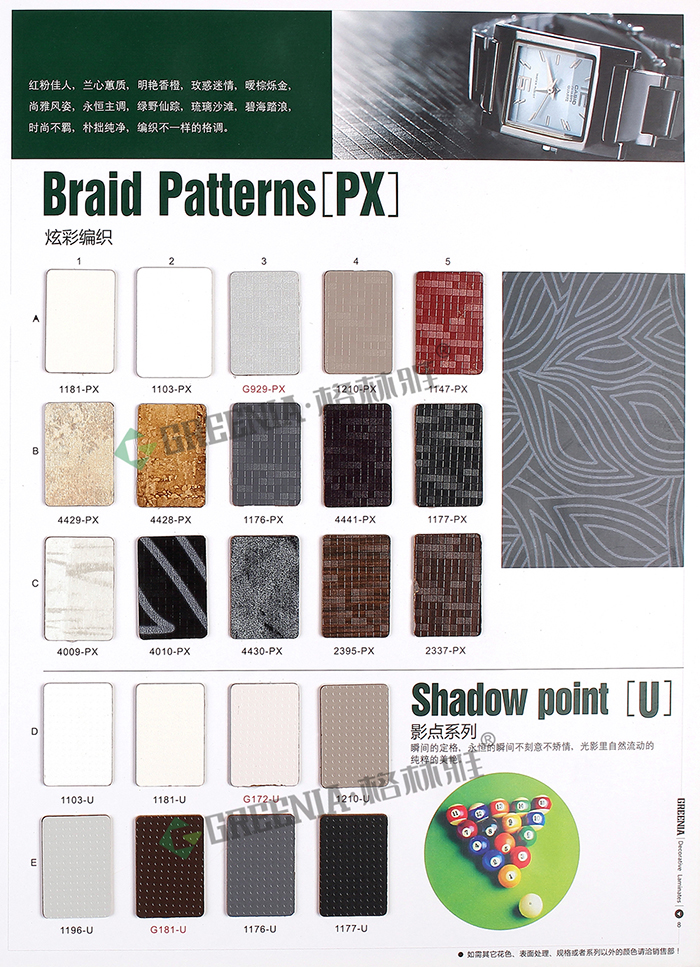 格林雅防火板擁有55種表面處理及3532種花色紋路,品種齊全。包括光面G、啞面M、絨面S、油漆P、霧面WS、波浪紋RS、壓木紋X、編織紋PX、優(yōu)雅皮紋XO、皮紋SL、壓木紋SH、拉絲ST、刷木紋F、優(yōu)雅刷木紋MF、絲絨面CF、羽翎面FT、纖絲紋、天然木皮、影點U、橫紋E、豎紋H、雨絲紋MV、橫紋WH、原木刷紋WB等多種不同的表面處理,可做成平板、彎曲板。歡迎您來樣定做!